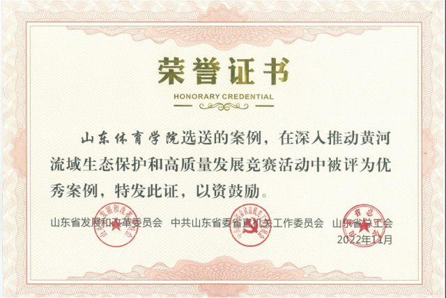 近日,我校《赓续黄河血脉共促共享健康——山东体育学院发起成立黄河流域体育健康产业高质量发展共同体》案例,荣获山东省发展和改革委员会、中共山东省委省直机关工作委员会、山东省总工会联合举办的“深入推动黄河流域生态保护和高质量发展竞赛活动”优秀案例,全省高校共有7项案例获此殊荣。